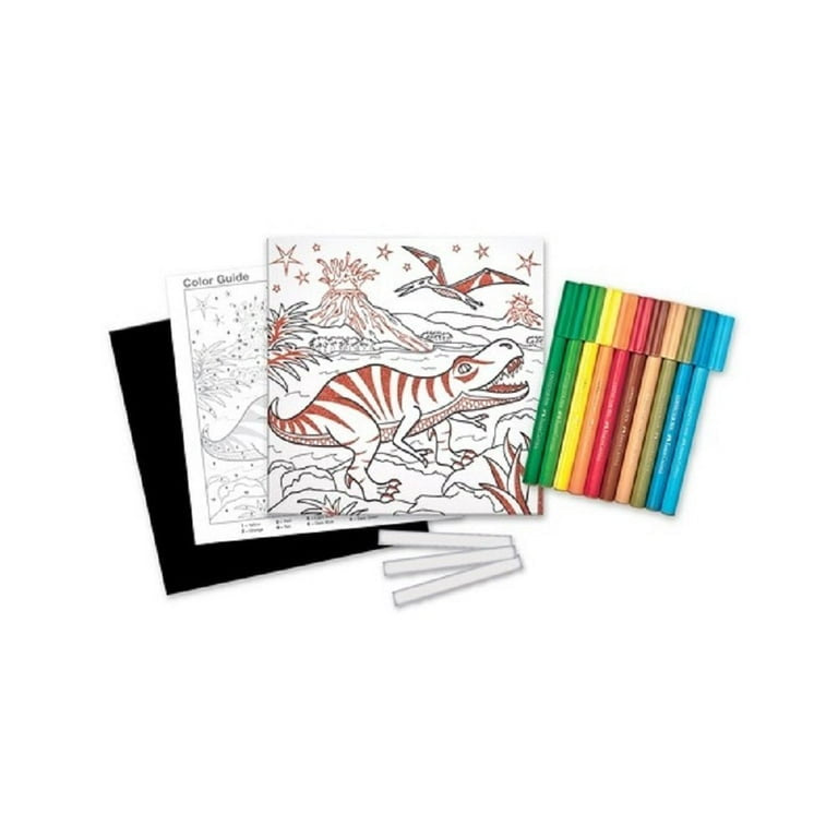 Flashy red foil makes this T-Rex scene pop! Kids will LOVE to color this fun color by number artwork and hang it on their wall. This guided art activity will appeal to kids who are interested in art and want to create a "masterpiece". The numbered color guide is printed separately from the canvas to allow young artists to follow the guide or color the picture their own creative way. The Connector Pens have a ventilated safety cap to prevent choking, easy-to-grip barrels and strong tips that can be re-hydrated. The water-based inks wash out of most fabrics.