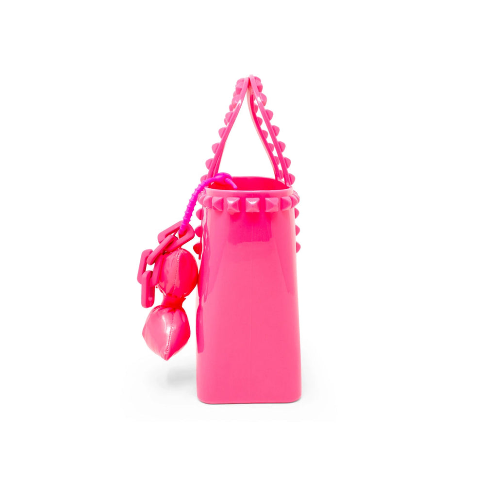 Our jumbo jelly tote bag – a stylish blend of compact design and easy maintenance. Adorned with studs on the handle and top, this roomy tote is both edgy and functional. Crafted from wipeable jelly material, spills are no match for its easy cleaning. The surprisingly spacious interior is complemented by a playful bow bag charm, making it your go-to accessory for any occasion. Elevate your style effortlessly – grab our Jelly Tote and make a statement!