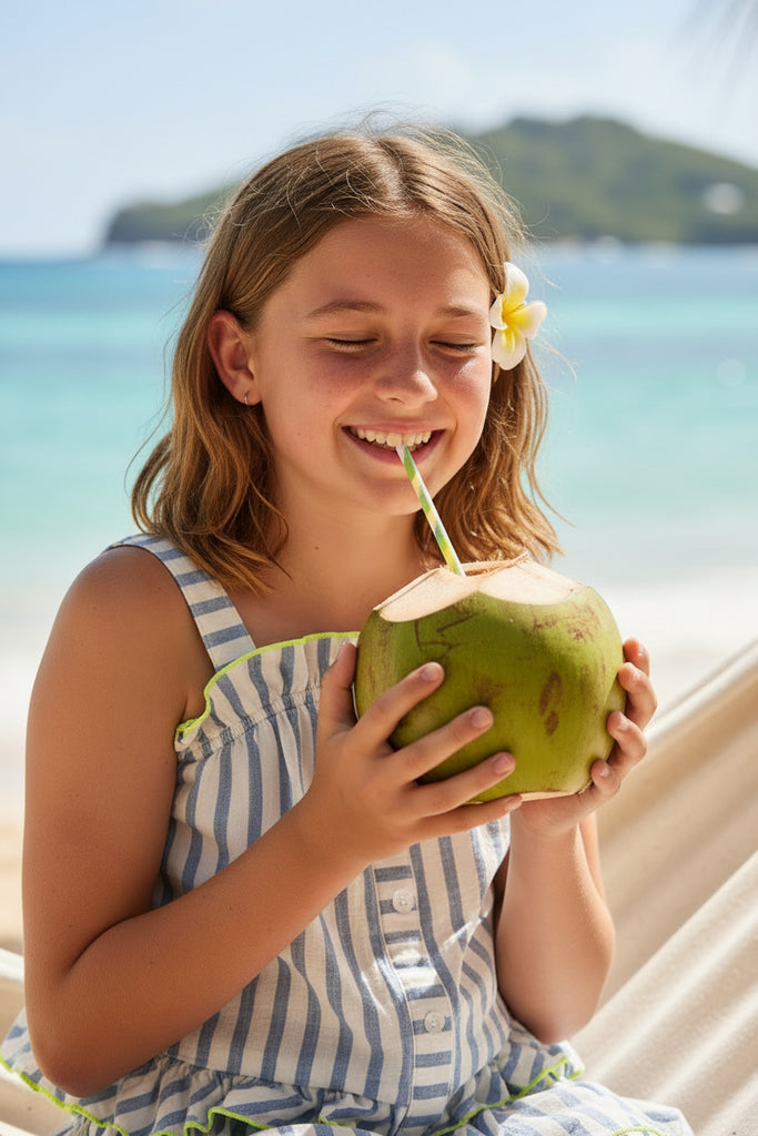 Summer freshness for little explorers: this strappy cotton blouse from BILLIEBLUSH combines a delicate striped print with playful ruffles at the top and bottom. The contrasting bourdon underlines every detail with charm. Light and easy to wear, it promises days full of games and imagination, we love its chic and mischievous side.