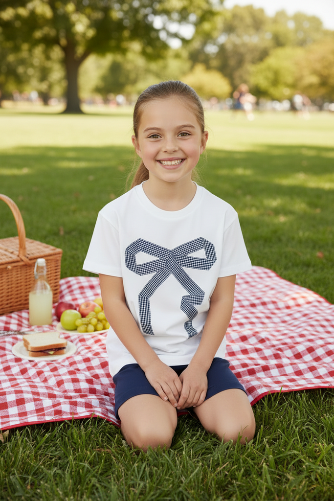 NAVY GINGHAM FABRIC BOW ON JERSEY SHORT SLEEVE TEE